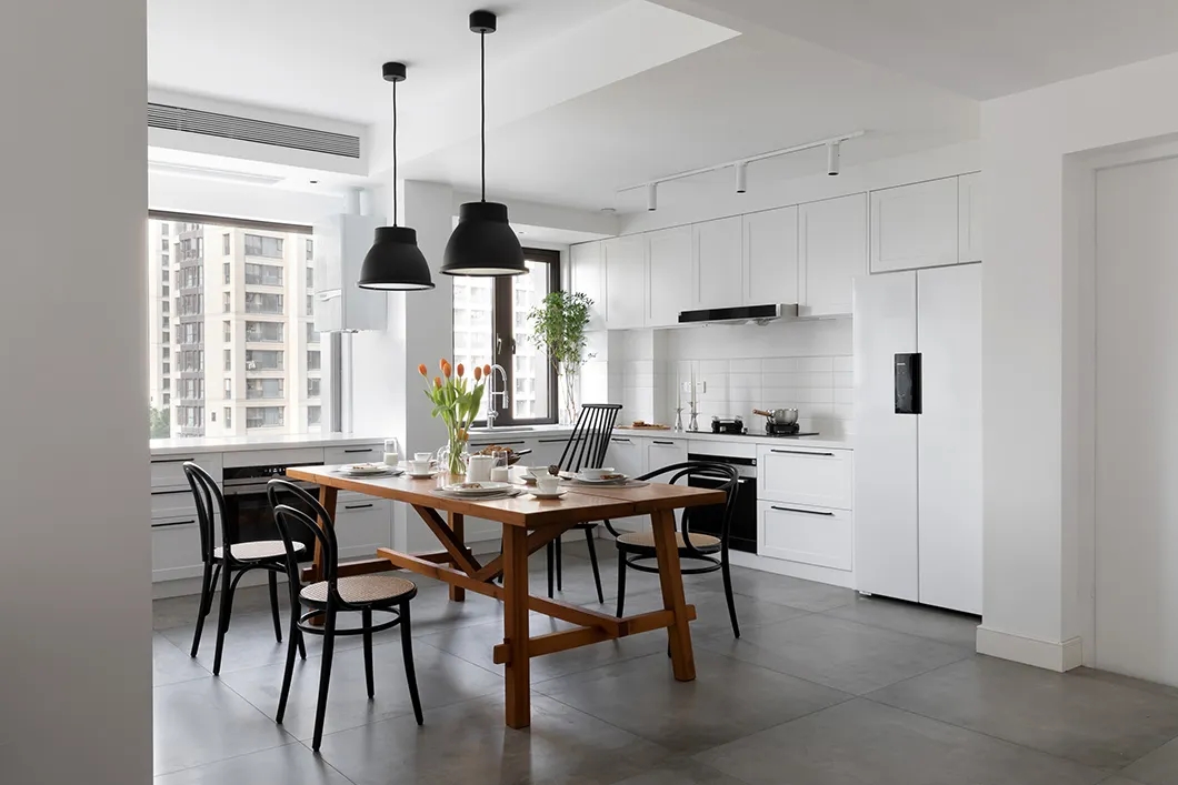 室内餐厅装修案例,餐厨空间其实和客厅空间没有区分的那么明显,好似一个整体。