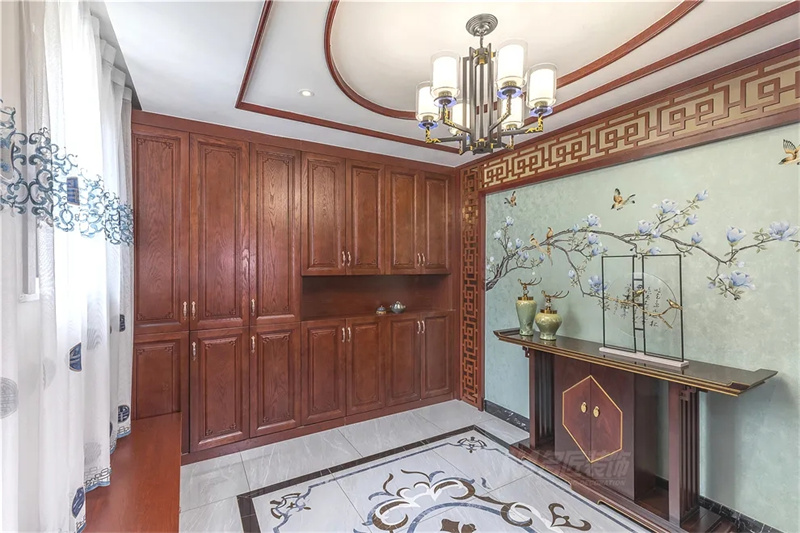 玄关鞋柜重在实用,设计师在各空间都运用了这样沉稳高雅的红棕色。端景重在营造意境,枝头绽开的春意,让居室独具清新感。整体搭配装饰有度,精致有加。